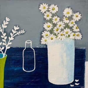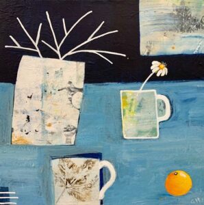 Working mostly in acrylics, Gilly Hemmer paints still life pieces, little houses and landscapes. Her work is naïve and abstract in style, capturing her emotional response about a subject through her perception of places and objects.  She draws inspiration for pattern, shape and texture from ceramics as well as plants and trees from the natural world, in a mix with domestic paraphernalia and interiors.